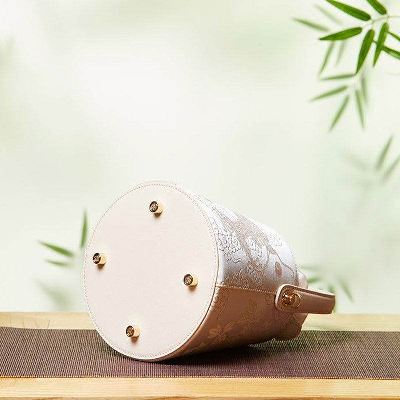 Brocade Jacquard Leather Drawstring Beige Bucket Bag Loong Pattern