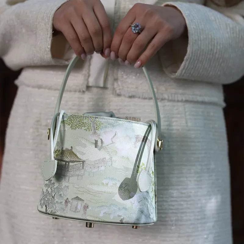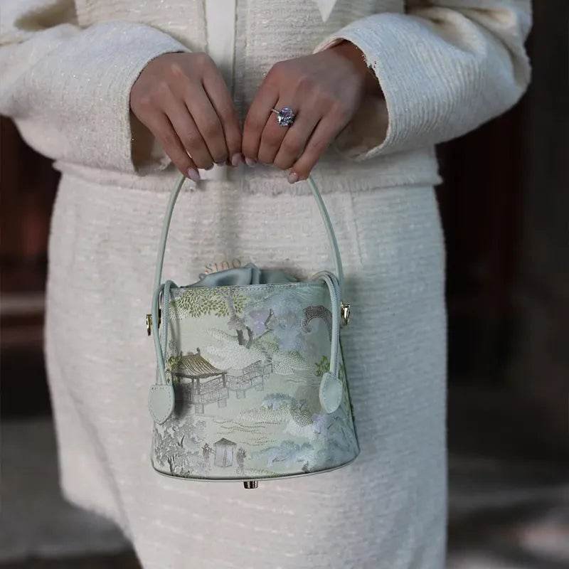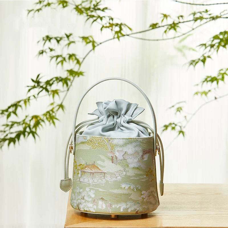 Inspired by the serene palette and flowing brushstrokes of classical Chinese landscape painting, this designer bucket bag is crafted from luminous mulberry silk in shades of jade, moss, and ink-wash green. Each bag resembles a wearable scroll of art, where silk becomes the canvas and nature becomes the design.
