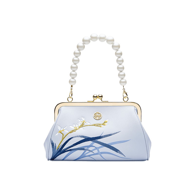 A deep, tranquil blue leather sets the stage for an exquisite hand-embroidered orchid — a flower of rare beauty and refined grace. This kiss lock clutch merges the timeless allure of vintage hardware with the delicate artistry of Eastern flora, finished with a detachable chain for versatile wear. It is an evening essential that speaks in whispers of mystery, luxury, and cultivated taste.