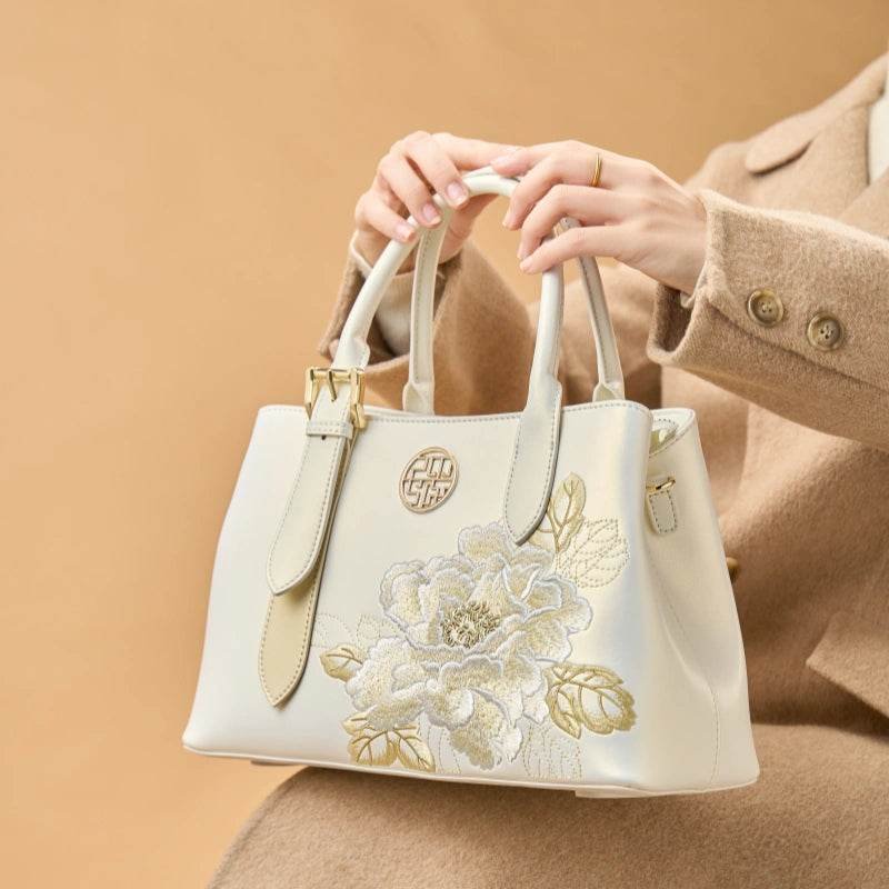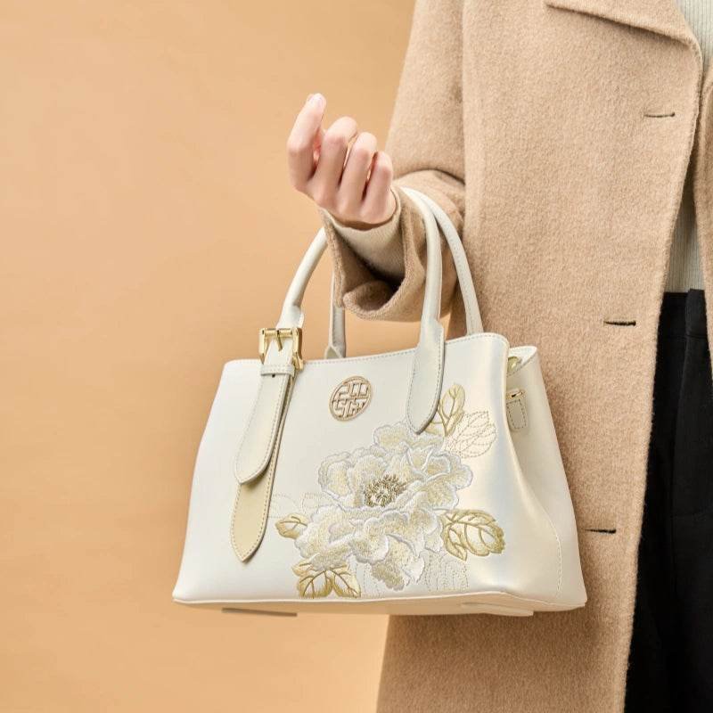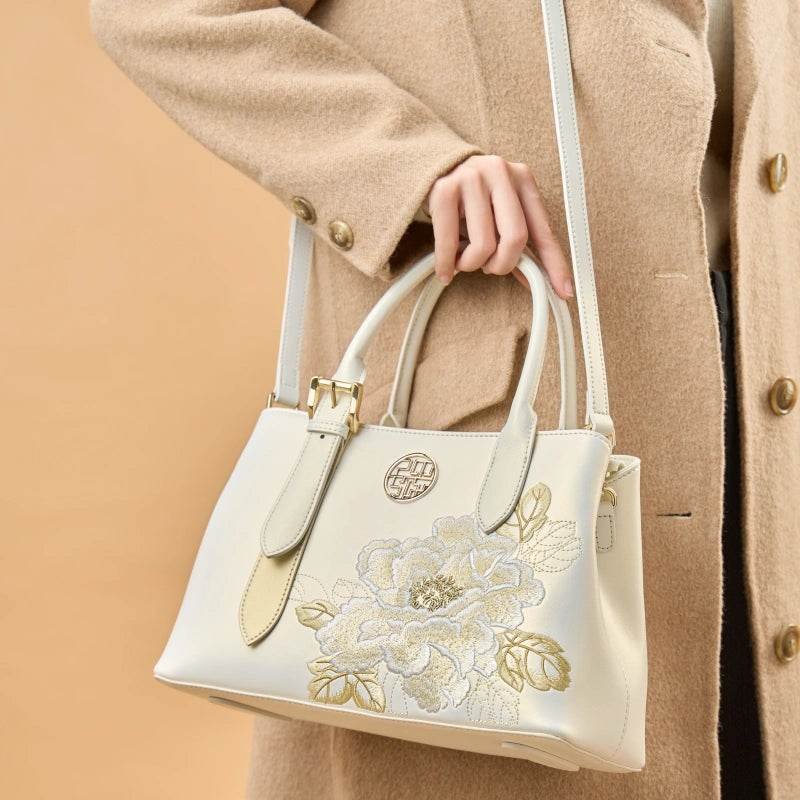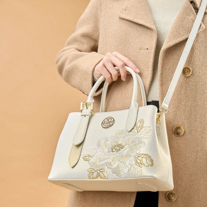 Against a backdrop of pristine white, top-grade leather, blooming peonies are meticulously stitched, their beauty unadorned yet rendered with ivory white, pearlescent silver, and pale gold thread, capturing the true essence of national beauty. This bag eschews excessive ornamentation, radiating ultimate elegance through purity, embodying the Eastern aesthetic of “the most beautiful flowers bloom in the simplest way.” Holding it is like holding a pristine and elegant poem of a prosperous era.