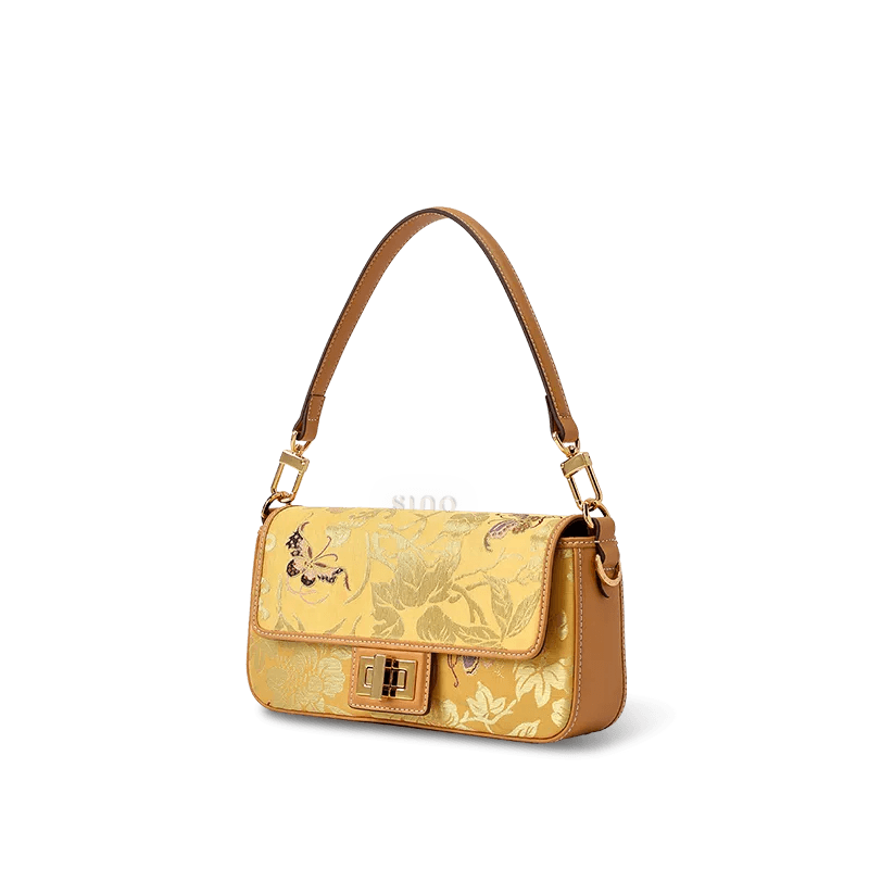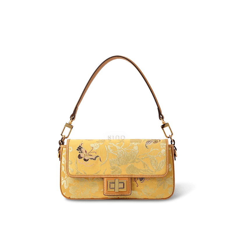This handbag is crafted in a vibrant true yellow hue, reminiscent of molten gold in sunlight—radiant yet imbued with a warm, gentle depth. The main body is fashioned from the classic “Ku Jin” weaving technique of the intangible cultural heritage Yunjin brocade, where real gold thread is used as the weft against a deep yellow base, outlining a three-dimensional pattern of dancing butterflies. The butterfly motif combines gold-winding embroidery and seed stitching, creating a rich, tactile surface that brings the ethereal butterflies to life, as if poised to take flight—symbolizing “fortune arriving in succession” and shimmering with the brilliance of life as light dances across its surface.