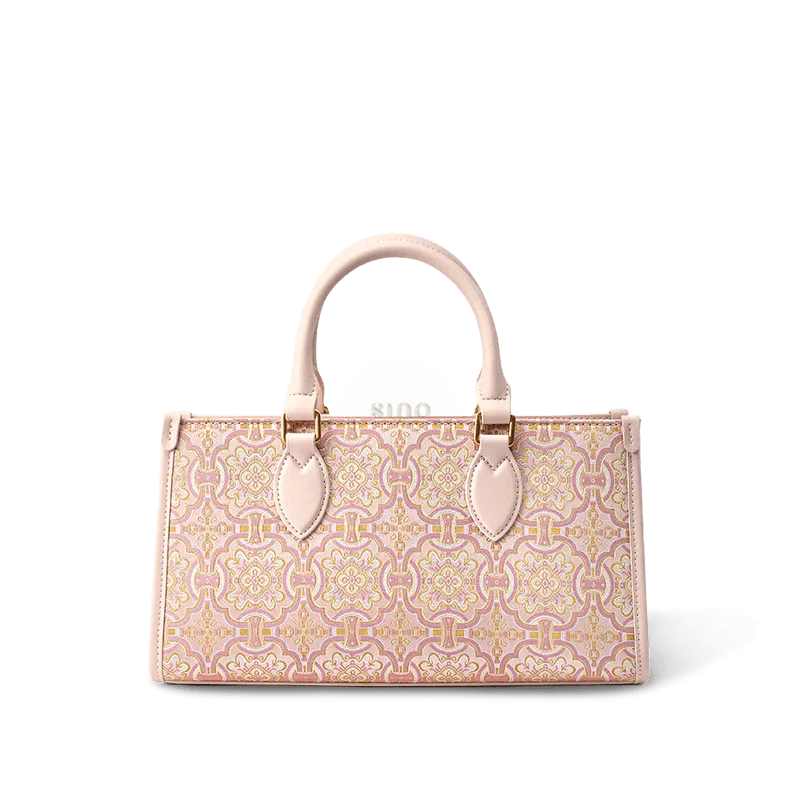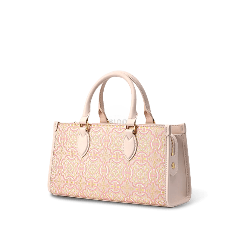 This handbag features a soft pink hue as its primary color, reminiscent of spring peach petals, exuding a gentle yet confident charm. The body is crafted from high-quality embossed leather, with a delicate and soft texture that reveals a subtle luster under light—understated yet refined. The handle and edges are made of matching leather paired with light gold metal fittings, seamlessly and securely attached, giving the bag clean and fluid lines. The interior is thoughtfully compartmentalized for practicality, making it suitable for both daily outings and semi-formal occasions. It beautifully merges the auspicious symbols of classical culture with modern fashion, serving not just as an accessory but as a tangible token of heartfelt blessings—gentle yet powerful, vintage yet stylish.