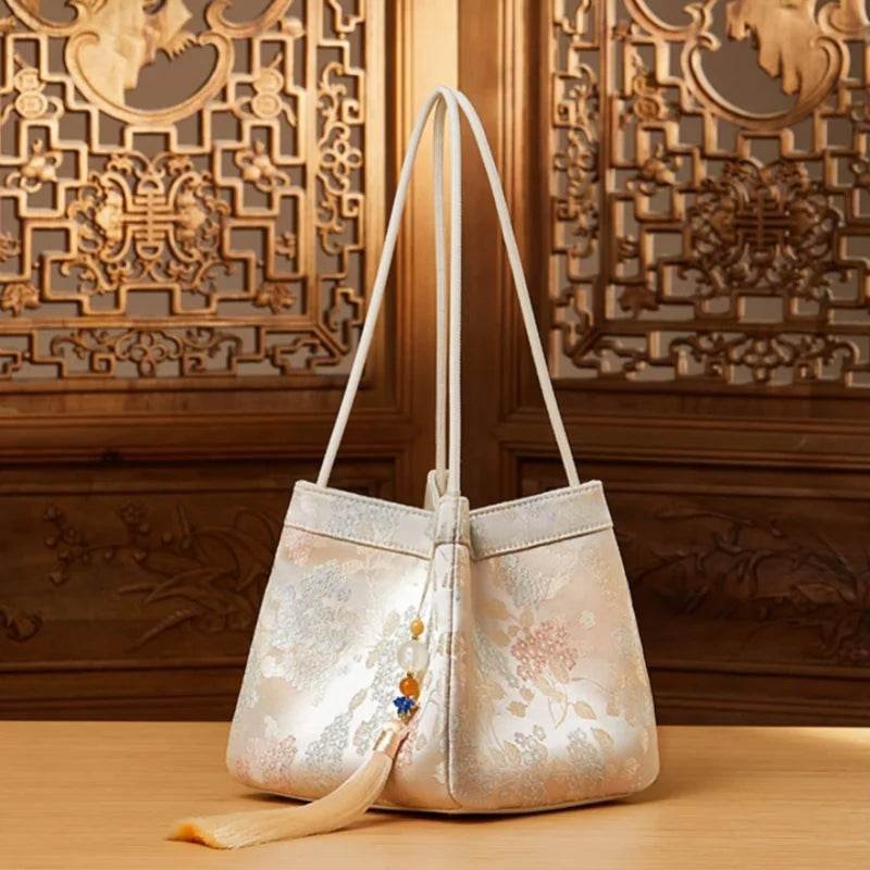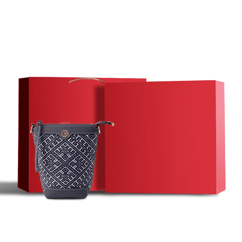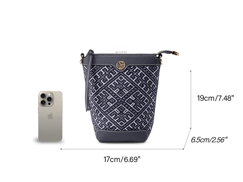 This bag skillfully blends the luxurious elegance of imperial brocade with the lively vitality of swallows in springtime. Using brocade as its backdrop and swallows as its subject, it creates a unique piece that embodies auspicious symbolism while radiating modern energy. Swallows flitting among the brocade clouds symbolize “the return of spring and the arrival of blessings,” infusing the classic bucket bag shape with poetic charm.