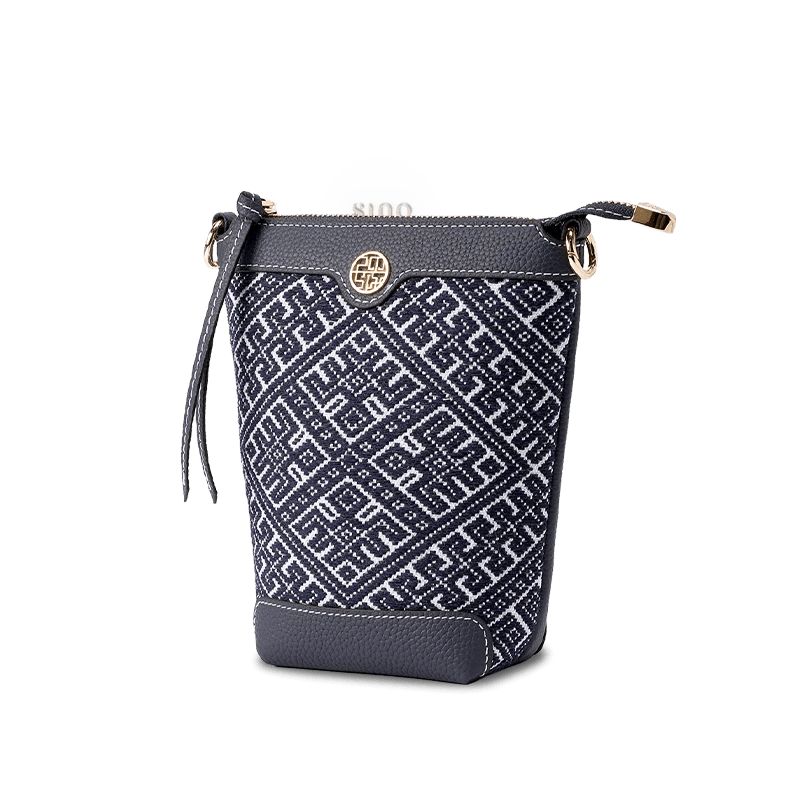 Zhuang Brocade Flying Swallow Motif Embroidered Leather Bucket Crossbody Bag